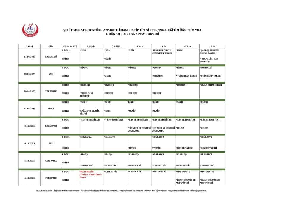 1. DÖNEM 1. YAZILI SINAV TAKVİMİNİ YAYINLIYORUZ. HAYIRLI OLSUN. TÜM ÖĞRENCİLERİMİZE BAŞARILAR DİLİYORUZ.